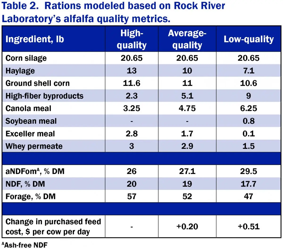 With recent breakthroughs in the understanding of fiber digestibility, nutritionists have more confidence in the impact forage fiber quality has on cow performance. Rock River Laboratory’s data in Table 1 was used to model three different rations, based on alfalfa quality, in Table 2. The three rations were formulated to meet nutritional requirements of high-producing dairy cows using prices from July 2018 in southern Wisconsin. Corn silage makes up 35 percent of ration dry matter (DM) and dietary protein fractions and starch levels were held at equal values for all rations. Haylage was optimized into the rations based on quality. The final rations contained forage levels at 57, 52 and 47 percent.