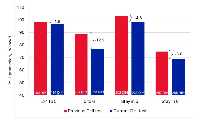 I averaged milk production by pen and observed that, when cows moved from Pens 2, 3, and 4 to Pen 5 without a diet change, milk production decreased by 1.6 pounds. When cows moved from Pen 5 to Pen 6 with a diet change, milk production fell by 12.2 pounds. For the cows that stayed in Pens 5 and 6, milk production dropped 4.8 and 6 pounds, respectively (Figure 1).