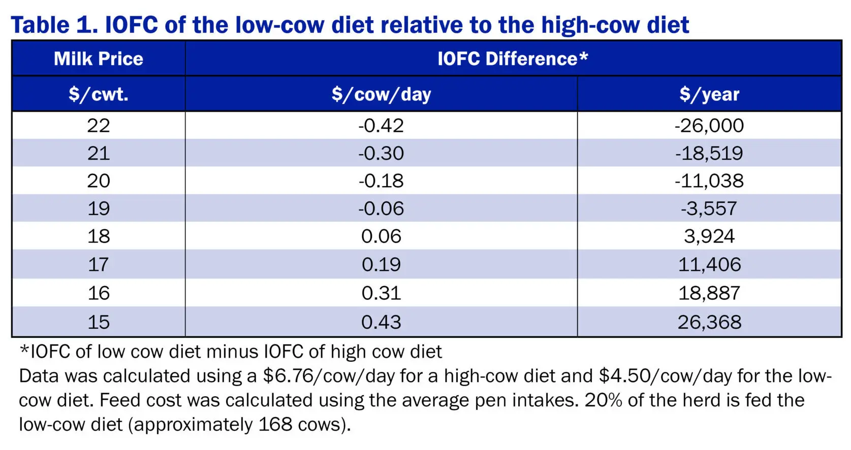 These results are farm-dependent, so farm-specific conditions and needs must be considered when determining grouping strategies. Stocking density, DIM, primiparous versus multiparous grouping, cow comfort, and barn layout also can affect IOFC.