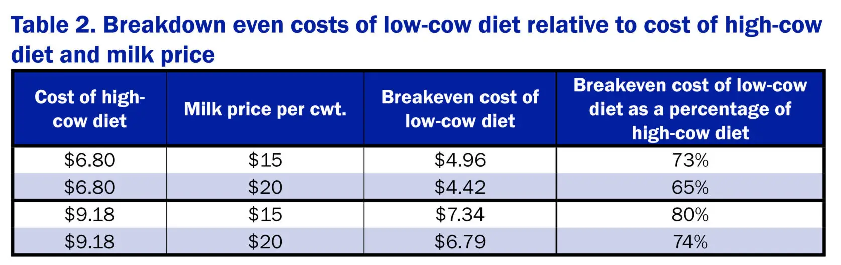 Grouping strategies are more beneficial when feed prices climb relative to milk price. Using the same farm data, Table 2 shows how the breakeven cost for the low-cow diet shifts as the cost of the high cow diet increases.