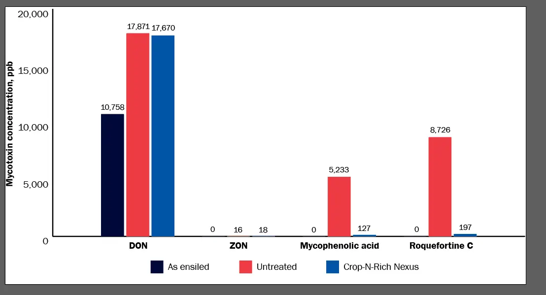 In the untreated corn silage, levels of mycophenolic acid and roquefortine C increased from zero at ensiling to more than 5,000 and 8,000 parts per billion (ppb) respectively. In the corn silage treated with Crop-N-Rich Nexus, mycophenolic acid and roquefortine C were remained at levels lower than 98% in untreated corn silage. This finding highlights the benefit of treating corn silage with Crop-N-Rich Nexus on mycotoxins produced by Penicillium mold. However, it is important to note in this study, Crop-N-Rich Nexus had no significant effect on DON or ZON concentrations. Therefore, the inclusion of feed additives as a mycotoxin mitigation strategy should still be the primary approach for feeds high in mycotoxins. Practically speaking, in most on-farm mycotoxin contamination cases a mixture of mycotoxins is present in the silage, so a multifaceted approach to minimizing effects and reducing mycotoxin risk is most likely warranted.