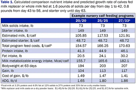To compare calf growth and cost of gain across milk replacer and milk feeding approaches, I used the NRC calf growth model to calculate calf growth (starting with a 90-pound calf at a thermoneutral temperature) across milk replacer and milk programs (Table 1). Milk replacers with a 20/20 formula and a 25/25 formula were used in the comparison along with milk with a 27/33 protein/fat concentration. For this example, I set intakes at 1.6 pounds per day of milk solids from day 1 to 42, 0.8 pounds per day from day 43 to 56, and starter only until day 63. Starter intake was held constant for this example at 149 pounds per calf or an average of 2.4 pounds per calf per day.