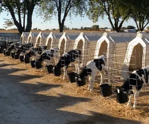 Pail holders should also allow buckets to sit level or slightly tipped toward the calf. Additionally, pail holders should have a divider or sufficient space between water and starter pails to prevent fowling of starter. Finally, pail holder design should prevent excessive calf starter shrink due to spilling or dumping pails. Placing pail holders outside of the calf hutch panels can decrease frequency of dunging in the pails, but can also increase shrink during rain and snow events.