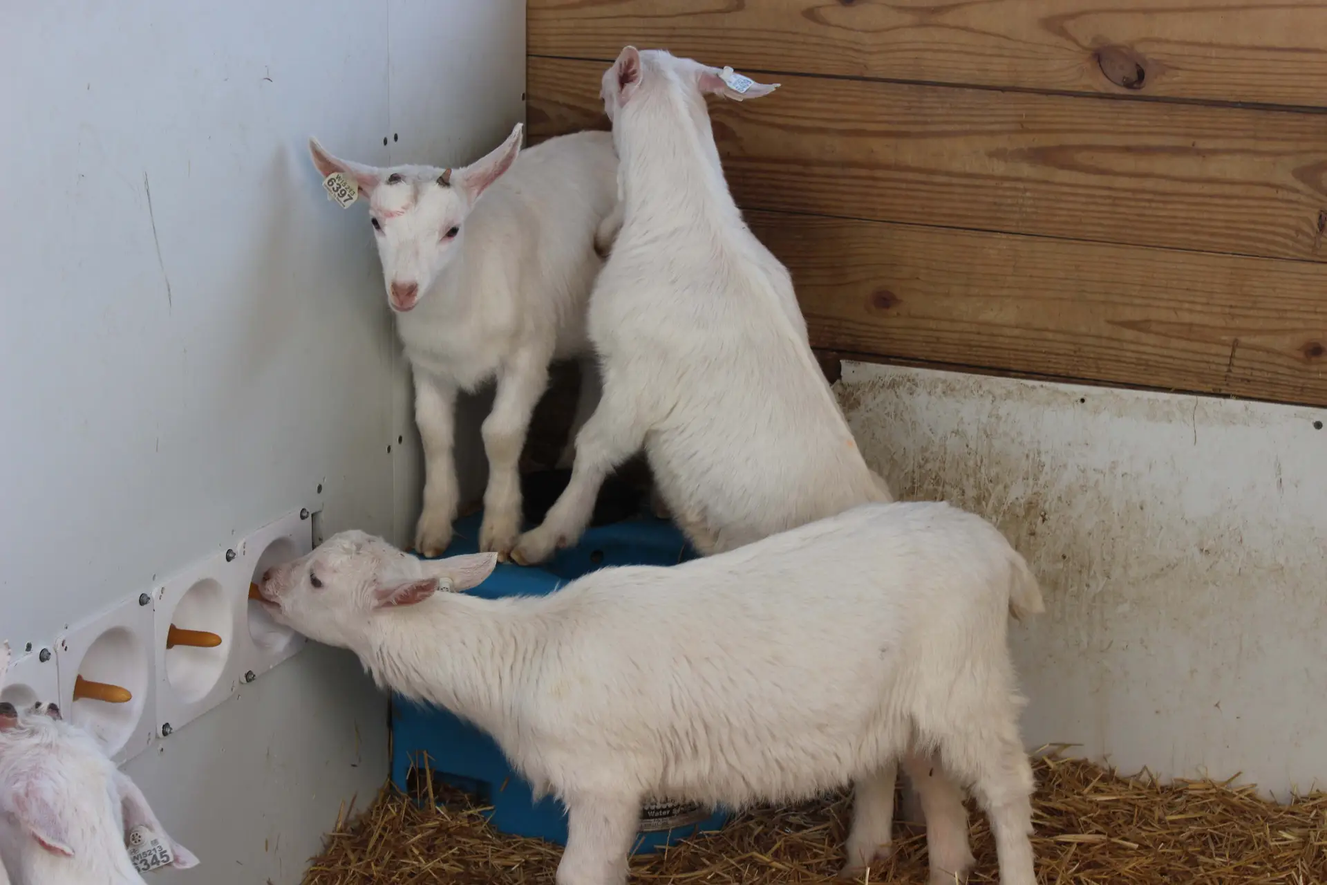 Next, kids move into a wire pen with three to four other kids for about five days and continue to be fed with bottles. Once they easily stand to be fed, they are moved to training pens where they are grouped with 9 to 11 other kids, and they learn to use autofeeders. After another five days, they move to their permanent pen with 15 to 20 kids.