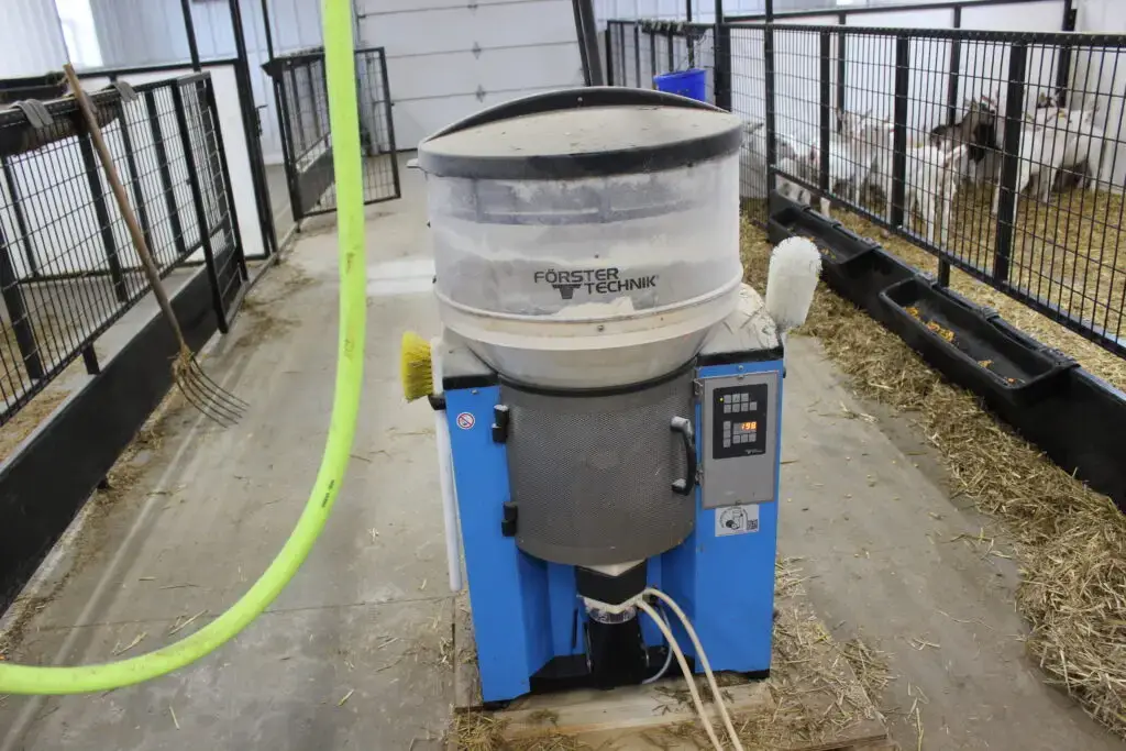 After the colostrum feeding, all kids are moved into the nursery. Buck kids are usually sold after one week, and doe kids are raised on-farm as replacements. They have 24-hour access to milk from the autofeeder, and are introduced to starter pellet at about two weeks old.