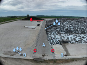 The manhole covers located throughout the feed pad (labeled B in the photo) are closed when the pile is built. Leachate flows over the closed manhole covers to the leachate channels. Furthermore, when a pile is open, water within the same 75-foot segment as the open silage face is directed over the closed manholes to the leachate channel to be contained in the lagoon.