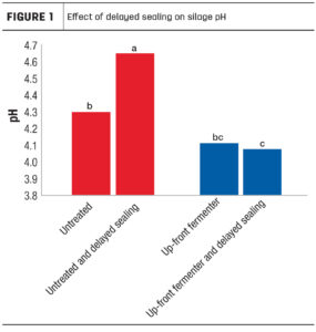 As shown in Figures 1 and 2, delayed sealing of the untreated silage led to a significantly higher pH and a significantly higher level of butyric acid. The higher pH makes the silage more prone to spoilage, with less sugar and starch available for cows to utilize. Butyric acid is not palatable and is highly likely to reduce intake. Spoilage microorganisms may also produce biogenic amines, such as putrescine and cadaverine, creating silage that may be dangerous to feed to cows.