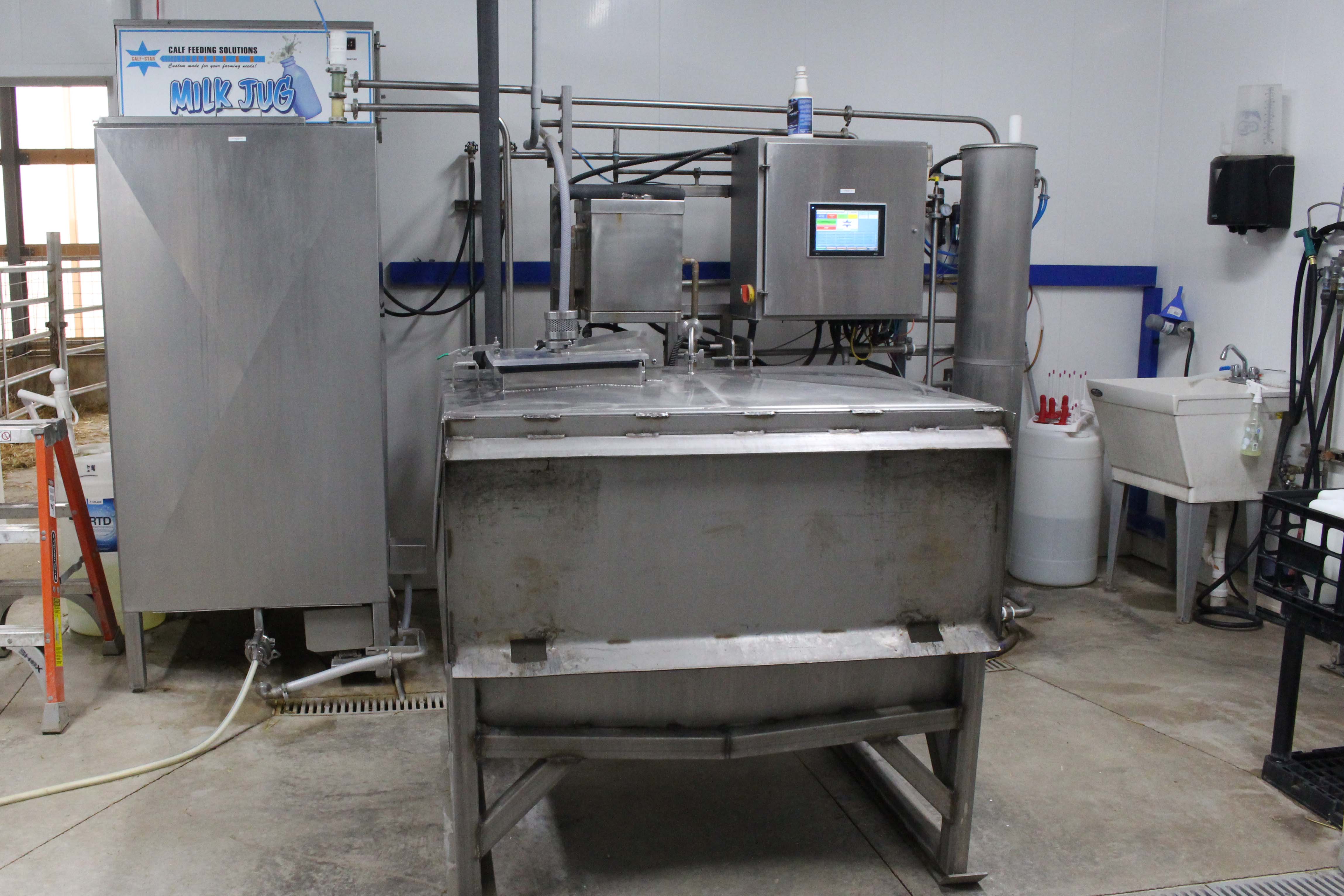 Whole milk is brought in a tank from the parlor to the calf barn with a skid-steer.  It is pasteurized in the calf barn and then cooled to 38 degrees F until it is used by the Holm & Laue autofeeder, which provides milk to four pens of calves.  The amount of milk fed gradually increases to 2.5 gallons per day.  At day 46, calves begin a two-week weaning period.  Ryan said the long weaning period leads to better grain intakes.